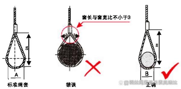 一般情況下,若客戶無需要求時,鋼絲繩索具長度是繩套長與套寬比的2:1的情況下的長度。假如吊耳過大,會使繩套夾角過大,在承重時。鋁管產生外張力,致使繩套抽脫,發生危險。應按圖所示,加大繩套長度,在受力狀態下,繩套的套長與套寬之比小于3.(以壓制鋼絲繩索具為例,插編鋼絲繩索具同理)