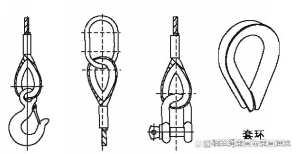 3、成套鋼絲繩索具與吊鉤、吊環、卸扣等連接處,是較容易受傷的地方,可加套環進行保護,延長索具的使用壽命。(以壓制鋼絲繩索具為例,插編鋼絲繩索具同理)