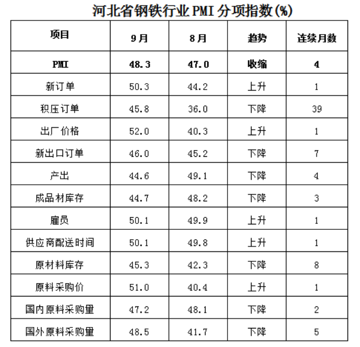 長城網訊(記者胥文燕 通訊員 付軍立)2019年10月1日,河北省冶金行業協會發布2019年9月份河北省鋼鐵行業PMI為48.3%,環比上升1.3個百分點。