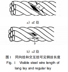 對同向捻鋼絲繩,3根相鄰股之中間股單根鋼絲可視長度要比交互捻大,所對應的鋼絲繩長度也長,單根鋼絲如果想獲得相同頻次的可視部位,同向挖需要的鋼絲繩長度要大,換言之,對固定長度同向捻鋼絲繩,單根鋼絲被重復可視的頻次要比交互捻少,因此,標準規定同向捻工作機構級別相同時鋼絲繩最多斷絲數比交互捻要少是正確的。