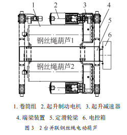 3)增加平衡滑輪調整繩速采用4/2倍率繞繩方式,由于第一層鋼絲繩與第二層鋼絲繩在卷筒上有高低差(即鋼絲繩直徑差),卷筒轉動時,上下兩層鋼絲繩進出繩速度會不一致,因此,通過增加一個平衡滑輪,調整繩速,使起吊平穩,解決了以往2臺電動葫蘆并聯時容易出現的出繩和入繩不同步的現象,提高了鋼絲繩電動葫蘆的使用壽命。