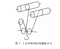 這種方式因結構形式加大,使得對適用場合提出更高要求,不能很好地適應空間小、吊鉤覆蓋范圍要求廣的場合。同時由于實際應用過程中鋼絲繩內應力的釋放,在使用一段時間后,會出現鋼絲繩出繩和入繩不能同步,導致亂繩現象。