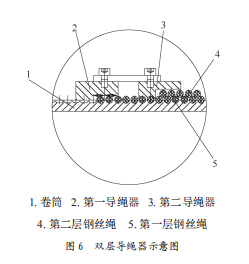 采用單根鋼絲繩雙層同向纏繞的方式:鋼絲繩兩端分別固定于卷筒的同一端部,鋼絲繩的一端在卷筒上卷繞形成第一層鋼絲繩,鋼絲繩的另一端在卷筒與第一層鋼絲繩上卷繞形成第二層鋼絲繩。同時卷筒上安裝有防止第一層鋼絲繩亂繩的第一導繩器,第一層鋼絲繩上安裝有防止第二層鋼絲繩亂繩的第二導繩器,2個導繩器之間向固定連接,如圖6所示。運行時,第一導繩器與第二導繩器同時工作,向相同方向移動,從而實現兩層鋼絲繩能同時卷繞或釋放,進而實現在電動葫蘆體積不變的情況下,起升高度幾乎是原電動葫蘆的2倍,大大提高了電動葫蘆的起升高度。