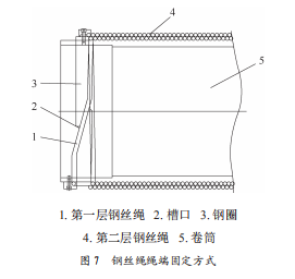 由于第一層鋼絲繩和第二層鋼絲繩在卷筒上有高度差(即鋼絲繩直徑差),使得在卷筒上固定時不能很好的固定,故需在卷筒上鋼絲繩固定端焊接一鋼圈,鋼圈上開一槽口,將第一層鋼絲繩穿過槽口用壓繩器固定在卷筒上,第二層鋼絲繩用壓繩器固定在鋼圈外表面上完成整個電動葫蘆的繞繩。如圖7所示。