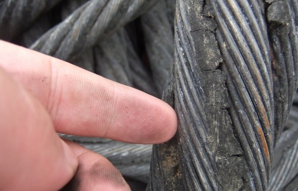 當(dāng)發(fā)生密集斷絲或者有一繩股斷裂時(shí)應(yīng)予以報(bào)廢;