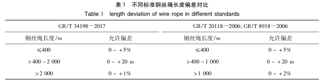 20118-2006、GB/T8918-2006等,本標準對超過1000m鋼絲繩的長度偏差加嚴。不同標準鋼絲繩長度偏差對比見表3。