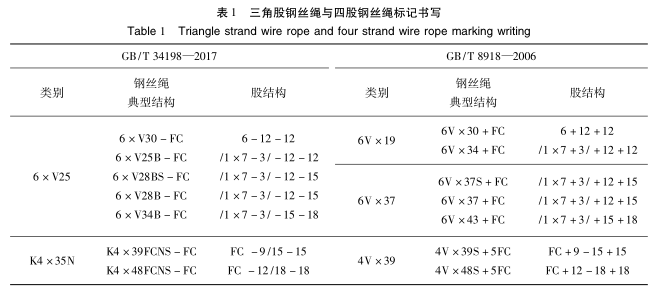 《鋼絲繩術(shù)語、標記和分類》。在制定標準時三角股鋼絲繩分類與標記完全按照該標準,但對于俗稱的四股扇形股鋼絲繩,考慮到股的結(jié)構(gòu)屬性與鋼絲繩生產(chǎn)方法,文獻[7]與GB/T8706-2017進行了修改。本標準關(guān)于三角股鋼絲繩與四股鋼絲繩標記書寫與GB/T8918-2006區(qū)別見表1。