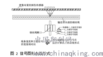 傳感器是通過探測鋼絲繩的導磁性能來判斷鋼絲繩的受損情況和輸送帶接頭是否出現抽動,性能良好的輸送帶通過傳感器時,傳感器不會發出任何信號,而一旦出現鋼絲繩斷頭或鋼絲繩的導磁性能變差等情況,則傳感器即可將檢測到的信號,經信號處理電路將信號轉換成方波。方波信號的寬度和鋼絲繩斷口大小成正比,斷口小、方波信號窄,反之,方波信號寬;同時,與鋼絲繩斷口到傳感器的距離成反比,距離越大,方波信號越窄。