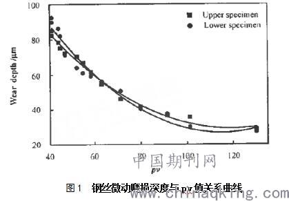 圖4表示出了微動振幅108.3μm、頻率3.6Hz,接觸載荷14N條件下對應的鋼絲微動磨損深度隨pv值變化的關系曲線。