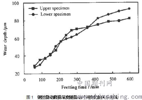 圖2表示出了微動振幅108.3μm、頻率3.6Hz、接觸載荷14N條件下的上、下鋼絲試樣磨損深度隨微動時間變化的關系曲線。