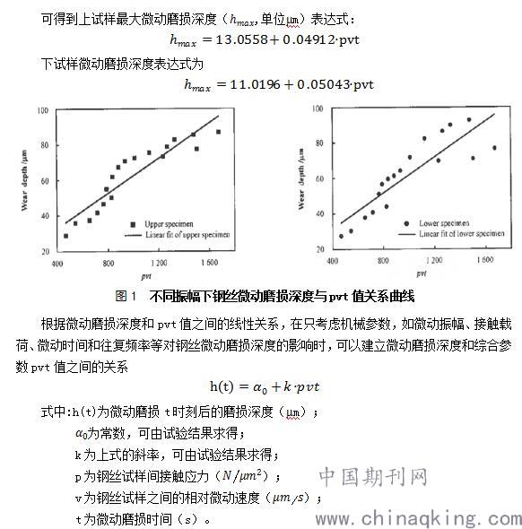 經過上面分析表明影響微動磨損的機械參數主要有接觸載荷、微動振幅、磨損時間以及往復頻率等;各個參數往往相互疊加、共同作用,從而使得微動磨損過程更加復雜;就鋼絲的微動磨損而言,很難用單一的參數來描述,采用綜合參數pv(接觸應力p和微動速度v的乘積)值及pvt(pv值和微動時間的乘積)值來比較全面地反映接觸載荷、微動振幅、微動時間和往復頻率等參數對微動磨損的影響,進而描述微動磨損深度的變化,并根據鋼絲磨損線性關系建立微動磨損理論模型。