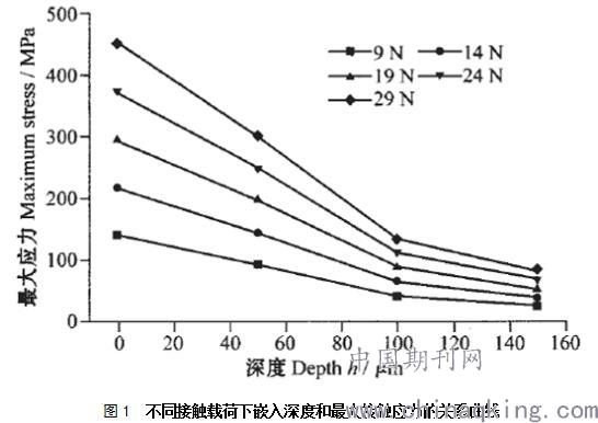 將各種計算條件下接觸區中心帶的最大接觸應力提取出來,建立不同接觸載荷、不同嵌入深度和最大接觸應力的關系曲線,如下圖所示。曲線表明,中心帶的最大應力隨著施加載荷的增加而增大,隨著嵌入深度的加深而減小。但是,在小的嵌入深度變化時應力的變化梯度較大,而嵌入深度達到一定值時,應力變化梯度減小。在小的相同嵌入深度下,接觸應力隨施加載荷增加的趨勢較快,而在大的相同嵌入深度下,應力隨施加載荷增加的趨勢變緩。這說明嵌入深度的大小,即是磨損深度應是影響應力分布的重要因素。