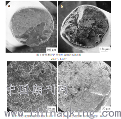 鋼絲的斷口形貌顯示了其疲勞特征,如圖4-6所示。斷口表面邊緣的損壞是在鋼絲繩斷裂之前,兩根斷裂的鋼絲終端相互的摩擦造成的,如圖4、圖5所示。