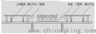 為了提高工作效率,我們專門加工四個門形架,其高度稍高于帶式輸送機(jī)上托輥的高度。硫化前,每兩個門形架為一組橫跨在上托輥的上方,并在機(jī)架上固定牢固后鋪上平板,兩個硫化平臺即搭設(shè)完畢(如圖1所示)。然后在兩個平臺之間只需拆除3架上托輥架,鋪設(shè)硫化底梁、水壓板、隔熱板和下加熱板,該工序即可完成。與通常的施工方案相比,可節(jié)約時(shí)間1h。