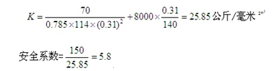 安全系數采用6倍時,其抗拉強度不能超過25公斤/平方毫米,因此這個安全系數是不夠的,因此需要加大繞過鋼絲繩的滑輪直徑,如果我們把直徑增加到160毫米,則可求得要求的安全系數(6. 34),滑輪直徑越大則鋼絲繩運行得越安全可靠,否則相反,如果不能靠加大滑輪直徑求得,則必須加大鋼絲繩直徑。