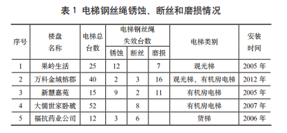 在電梯的年度定期檢驗過程中,經(jīng)常會發(fā)現(xiàn)電梯鋼絲繩存在失效的情況,可視的失效模式有:銹蝕、斷絲和磨損三種。鋼絲繩銹蝕的情況在觀光電梯和貨梯出現(xiàn)的比較多,從機(jī)房到井道到處都是紅褐色的鋼絲繩銹斑;鋼絲繩斷絲的情況是任何一種電梯都有存在的;鋼絲繩磨損的情況是伴隨著銹蝕,只要有銹蝕的鋼絲繩也就伴隨著磨損,鋼絲繩磨損在電梯機(jī)房就可以清楚看得到,鋼絲繩磨損時間久了就會再引起電梯曳引輪的磨損。通過收集過往的電梯檢驗情況(見表1),可以看出鋼絲繩失效情況的嚴(yán)重性。電梯鋼絲繩銹蝕、斷絲和磨損失效將直接導(dǎo)致電梯安全事故,為了盡可能避免人身事故的發(fā)生,應(yīng)該引起用戶、維保及檢驗相關(guān)部門的高度重視,促進(jìn)電梯的安全使用。