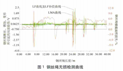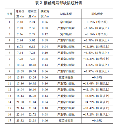 檢測結(jié)果:1)檢測鋼絲繩長度:38.76m。2)鋼絲繩金屬斷面積減少最大差值:15.30%,位置;7.28m。