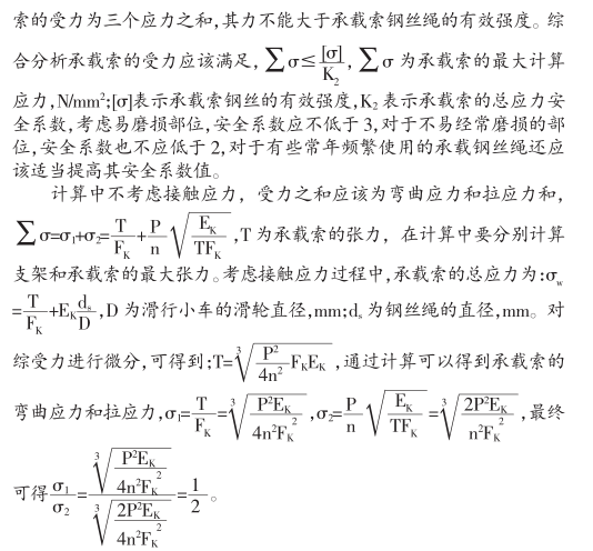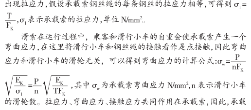 滑索在運行中,鋼絲絕受力不同,承載索受到3個作用力,其分別為接觸應力、彎曲應力、拉應力。3個作用力中,彎曲應力對承載索的磨損影響十分大,但對承載索的強度影響極小,國此,在進行滑索的承花索的選行計算分祈時,是把拉應力作為強度條件,把彎曲應力作為承截索耐房強度的驗算分析條件。彎由應力對于承載索也是十分重要,但是其計算十分困難,目前基本是結果理論知識進行救斷的,在實際中,一般都是用實際經驗和理論知識站合分析的,由于張力作用,承載索上會