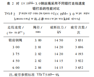 在鍛打過(guò)程中,對(duì)同一根鋼絲繩,采用不同的走線速度進(jìn)行鍛打,其性能也大不相同,對(duì)比試驗(yàn)結(jié)果見(jiàn)表2