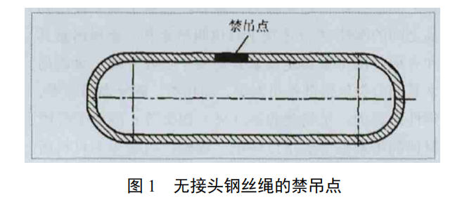 無接頭即為繩圈型式,通過子繩纏繞成型,可參考DIN3088標準。母繩成型過程是:子繩纏繞成圈,這個圓圈就是繩芯,再將子繩繞圓圈6周,使得無接頭的繩芯均勻分布在母繩兩側,這時母繩就稱作無接頭繩圈。通常繩芯的承受力不在無接頭鋼絲繩圈承受力范圍內,制成無接頭繩圈后,子繩破斷拉力總和的85%為每根繩的最小破斷拉力,承載作業的區域應避免無接頭鋼絲繩的禁吊點,如圖1所示。