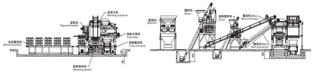 用途:生產各種外墻砌塊、內墻砌塊、花墻砌塊、樓板塊、護堤塊、連鎖塊、路緣石等砌塊。增加面料裝置可生產彩色路面磚。
